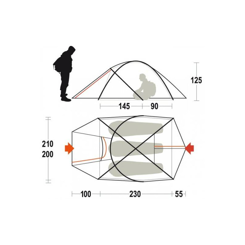 - Doppio tetto Poliestere Ripstop 50D, 80 g/m2, spalmatura poliuretanica, impermeabilità 4000 mm, idrorepellente, trattato FR