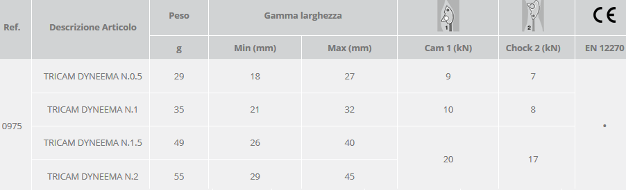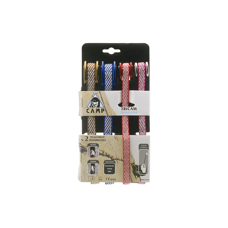 Kit Chocks 4 misure (0.5, 1.0, 1.5, 2.0) provvisti di fettuccia in Dyneema® e quindi più resistenti in caso di piazzamento attivo.
