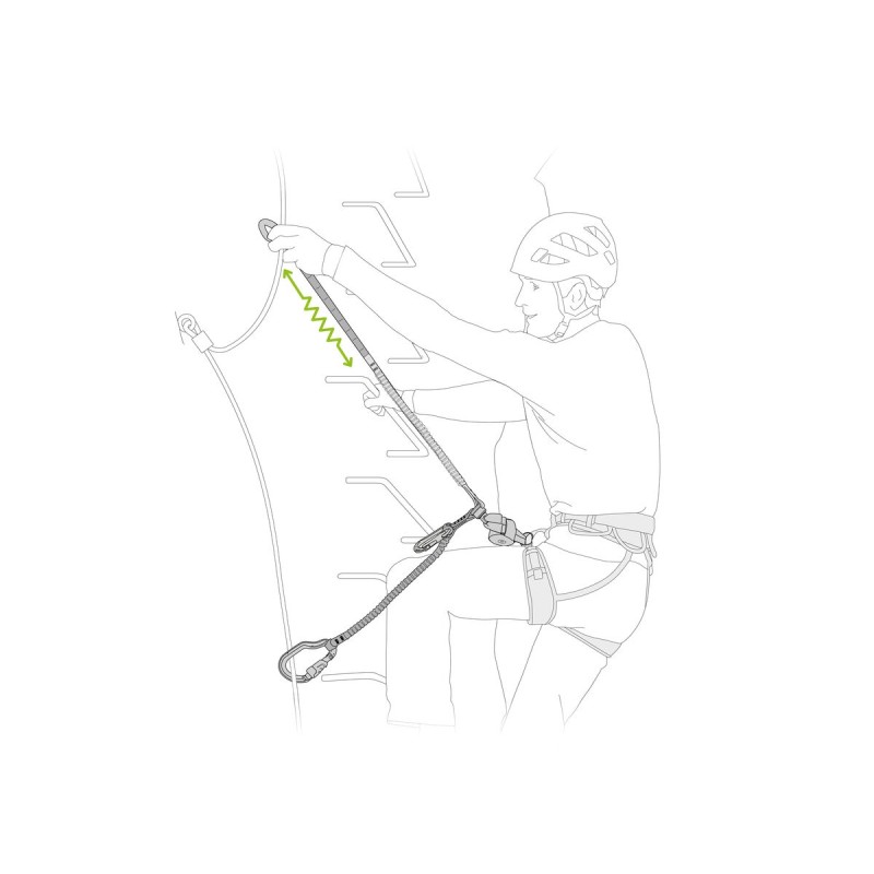 Cordino da via ferrata con moschettoni VERTIGO e girello. Grazie all’assorbitore ultracompatto e ai due capi elastici, ci si sposta agevolmente nel parco avventura.