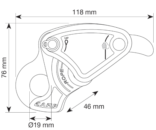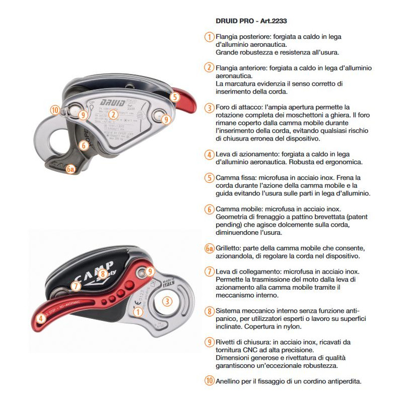 Meccanismo interno e camma di bloccaggio brevettati per un'azione delicata sulla corda, che evita l'usura precoce e consente l'assorbimento di leggeri shock attraverso un leggero scorrimento della corda all'interno del dispositivo.