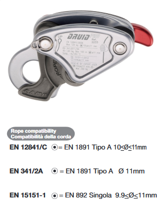 * EN 12841/C come discensore della corda di lavoro per persone fino a 120 kg, utilizzabile in situazioni di soccorso fino a 200 kg;