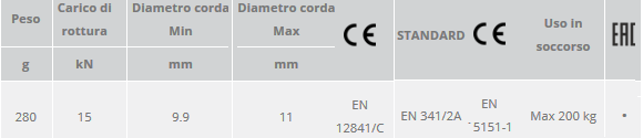 * EN 341/2A come dispositivo di discesa di emergenza su corda singola, per persone fino a 120 kg e corda semi-statica da 11 mm;