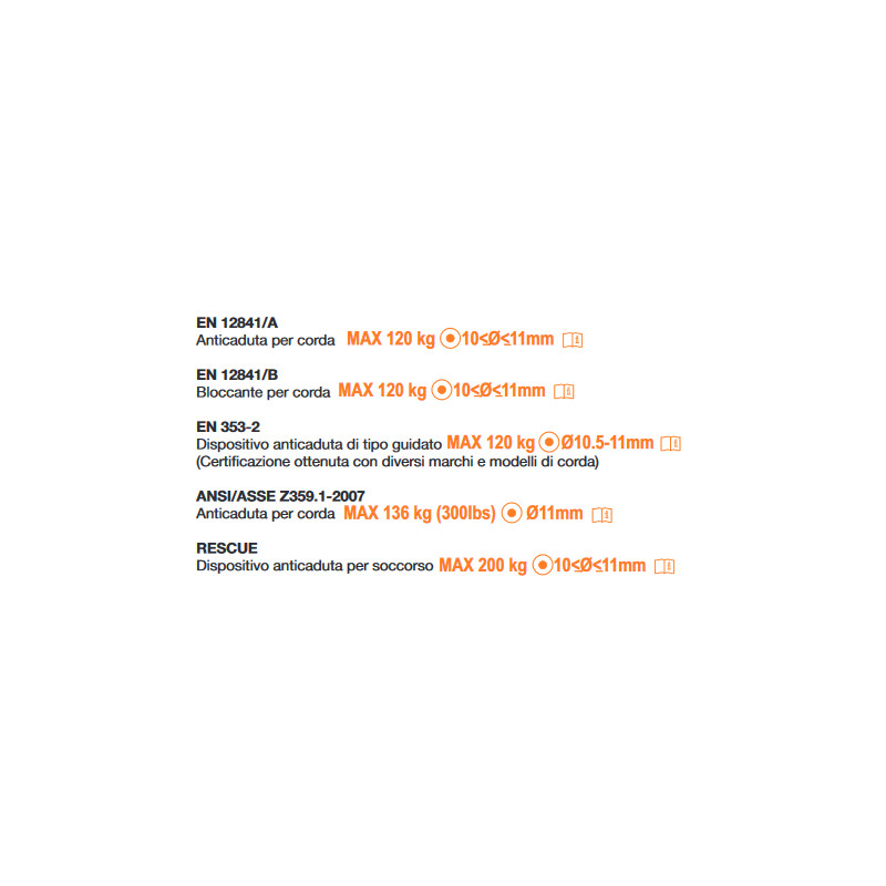 - EN 12841A/B per l'uso in accesso su corda come dispositivo anticaduta per la corda di sicurezza o come risalitore della linea di lavoro, per persone fino a 120 kg; utilizzabile anche in situazioni di soccorso fino a 200 kg;