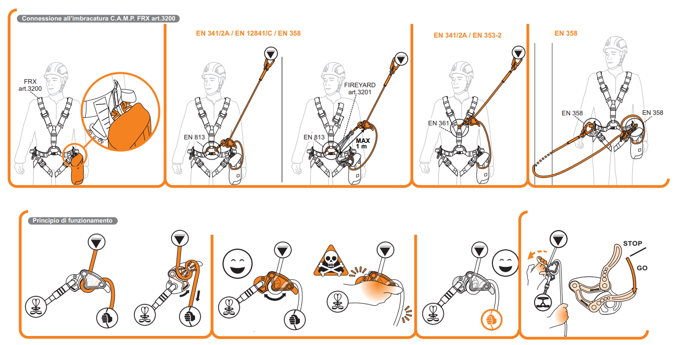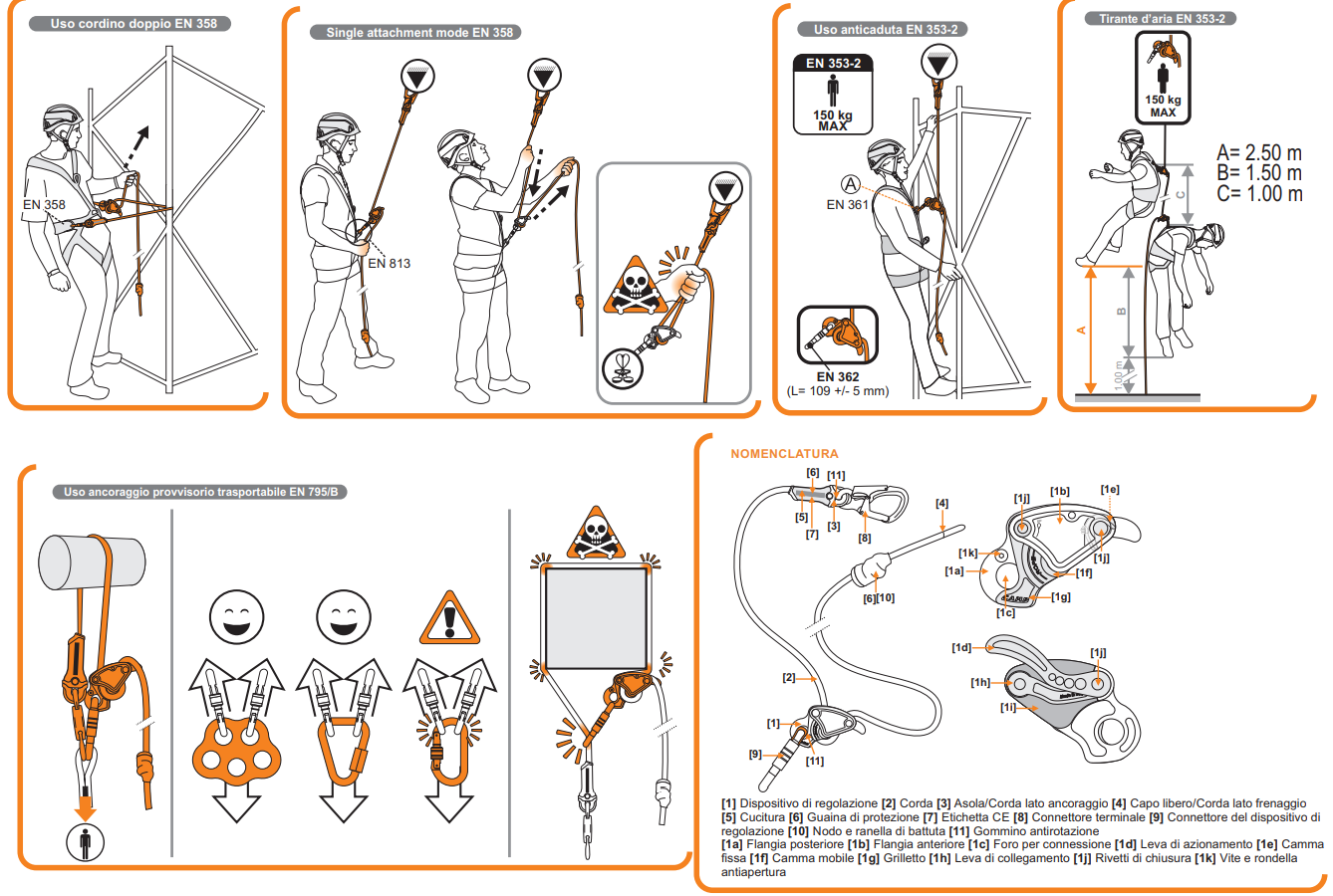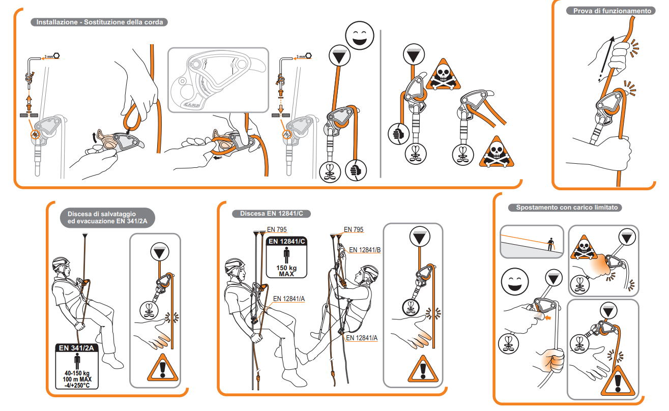 - Le grande versatilità e le certificazioni ottenute permettono molteplici usi: dispositivo di evacuazione di emergenza EN 341/2A, discensore per lavori in fune EN 12841/C, dispositivo anticaduta EN 353-2, cordino di posizionamento EN 358, dispositivo di ancoraggio EN 795/B.
