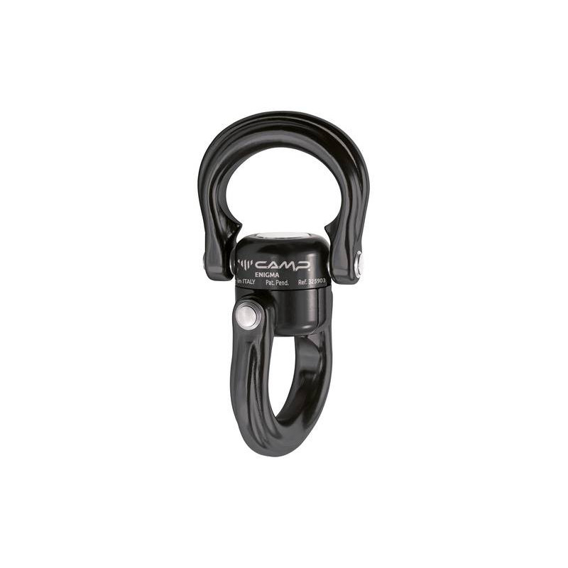 Enigma è un dispositivo girevole completamente apribile dotato di ampi anelli basculanti che permettono la connessione diretta di componenti metallici e tessili senza l'ausilio di moschettoni.