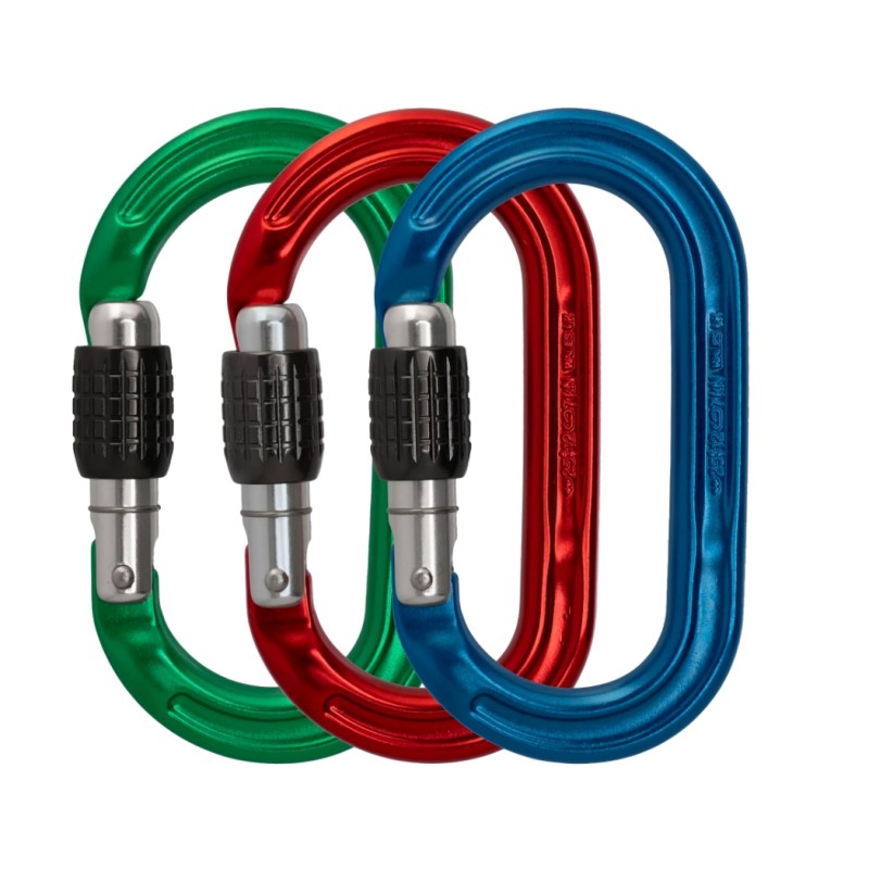 | Ultra O Screwgate 3 Pack Blue/Red/Green | A322-P3 | 63 x 109mm | 204g | 25kN | 12kN | 7kN | 22mm | EN362:2004 B EN12275:2013 X/B UIAA121:2009 |
