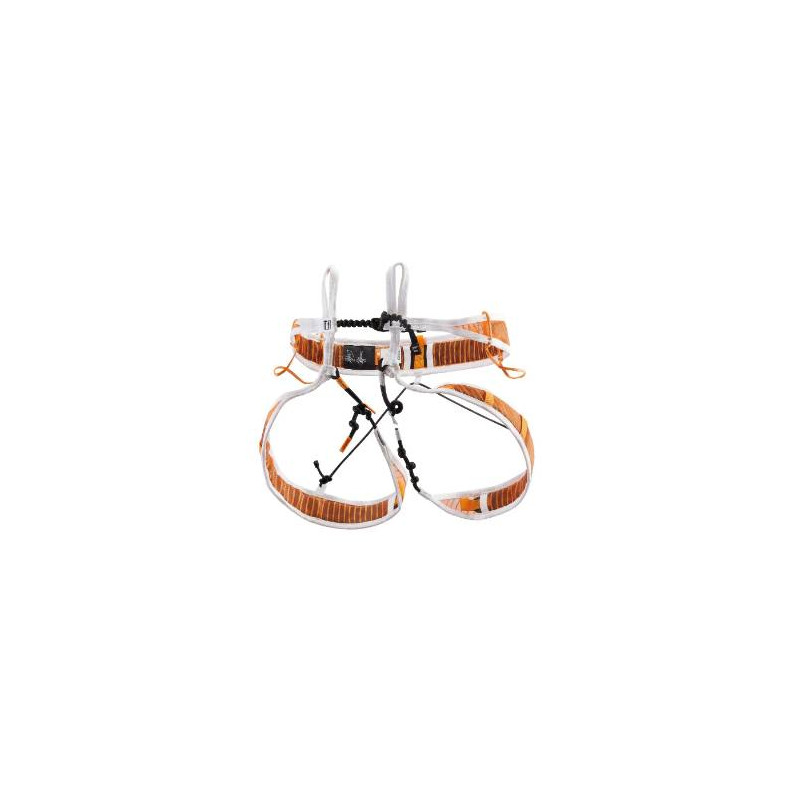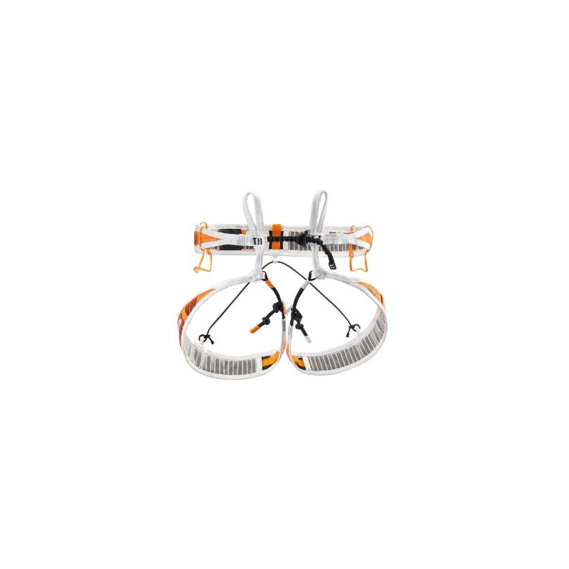 - costruzione innovativa senza fibbia (Brevetto Petzl). Un elemento scorrevole sostituisce la fibbia metallica per una regolazione della cintura semplice e rapida. I cosciali sono regolabili con un nodo bocca di lupo,