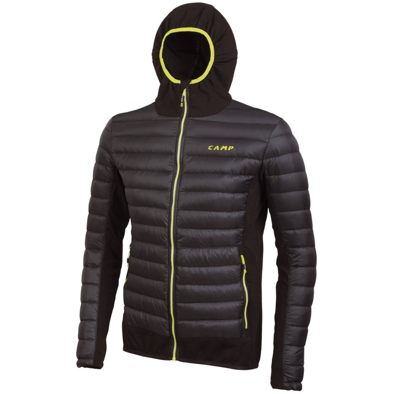 Giacca ibrida da uomo Hybrid Jacket di Camp con costruzione differenziata tra piumino e tessuto softshell, imbottita dove serve più calore ed elastica e traspirante dove serve tutta la libertà di movimento possibile durante escursioni, trekking e attività outdoor della stgione fredda, può essere usato da solo quando il freddo non è eccessivo o in combinazione ad altri quando la temperatura scende.