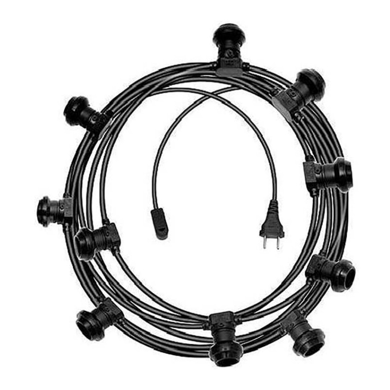 Catena di luci per ambienti interni ed esterni (ad esempio gazebo, giardino, tenda, veranda o cantina ) con 10 portalampada protetti contro gli spruzzi d"acqua IP 44 / E 27. Realizzato con il cavo H07RN-F 2 x 1,5 mm, lunghezza totale 10mt, spina bipolare stampata a iniezione DE.